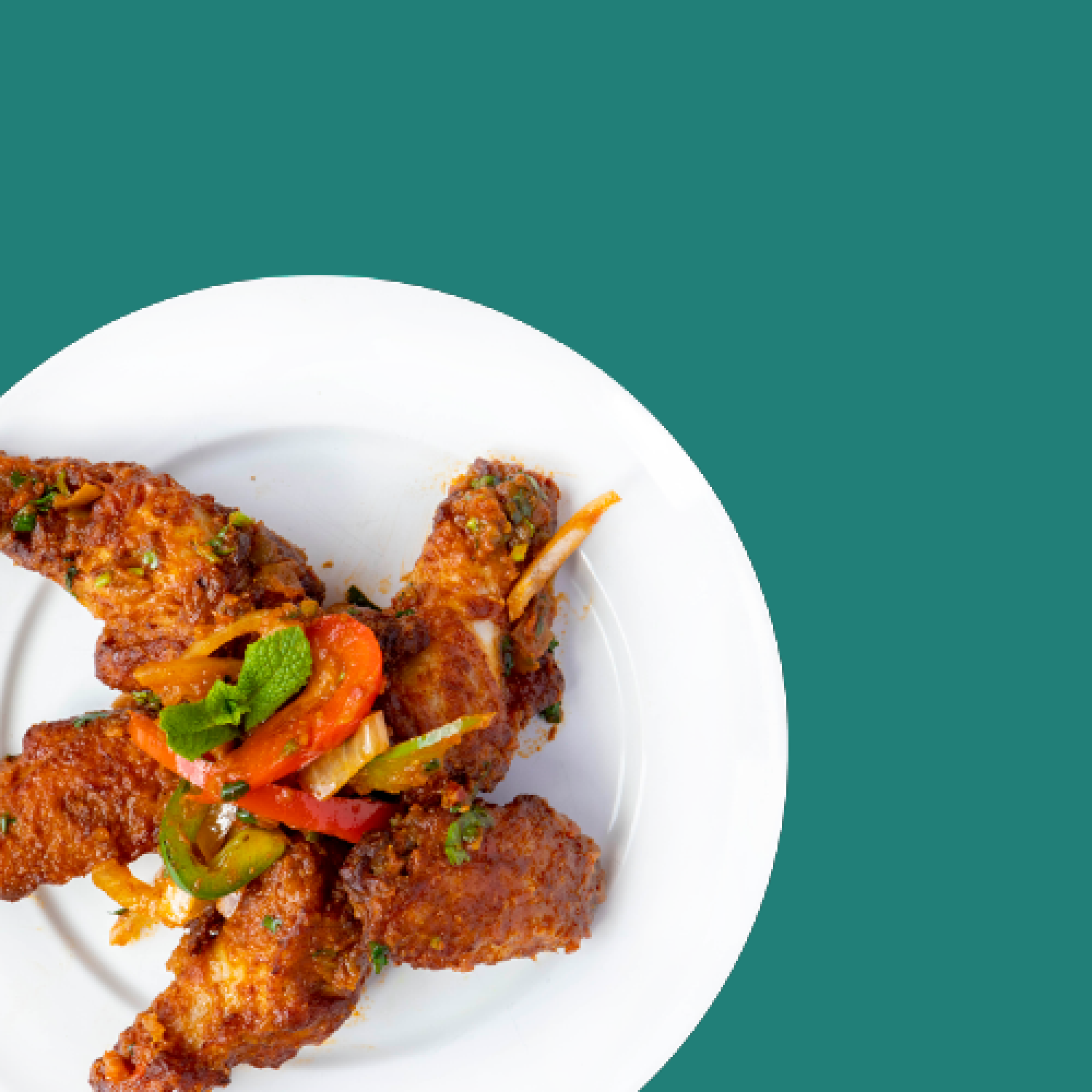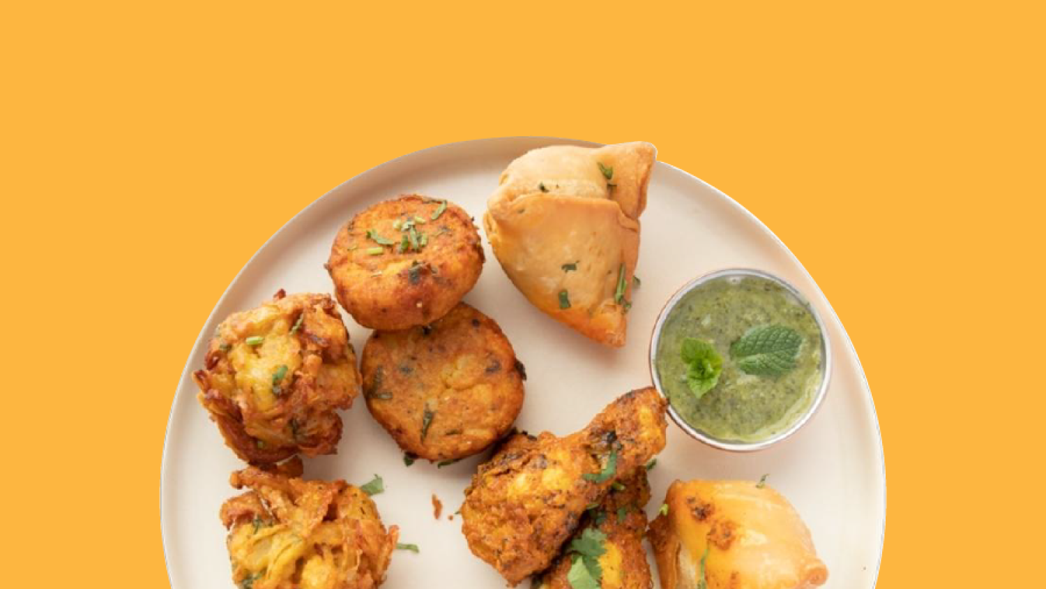 A selection of Indian tandoor wings, samosas and onion bhajis.